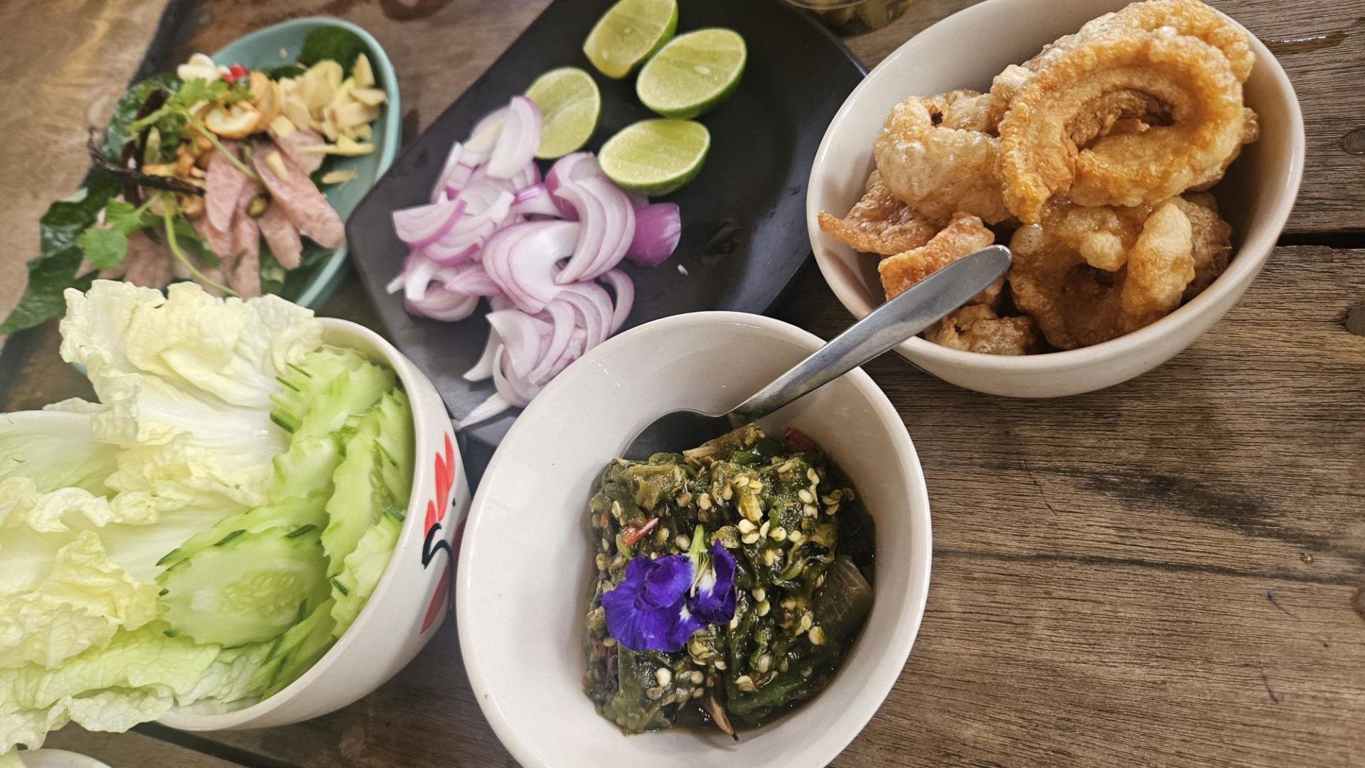 手前が、ナームプリックヌム その隣が、ケープムー 左奥がネームソムクアン